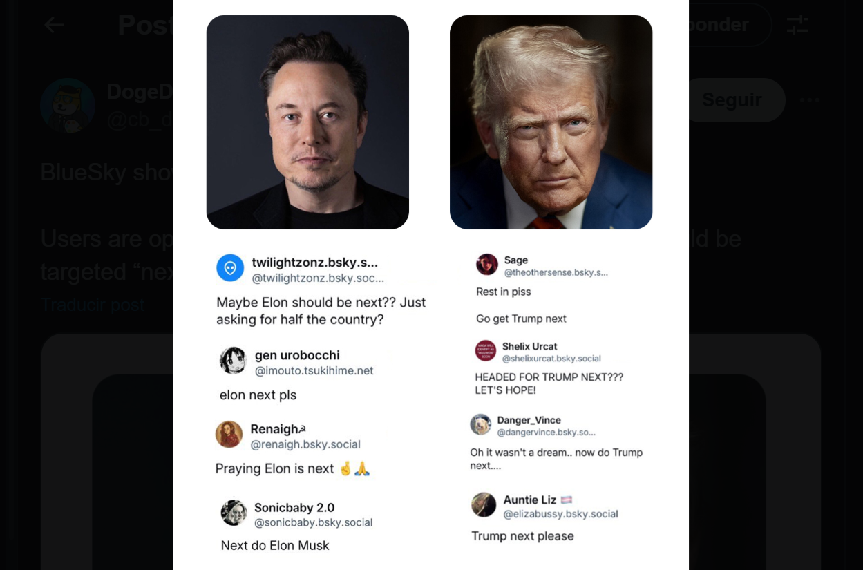 acompañadas de comentarios de usuarios de BlueSky como “@twilightznz.bsky.social”, quien pregunta si Musk debería ser el “próximo”, y “@theothersense.bsky.social”, que insta a “ir por Trump” tras desearle “descansar en paz” a Kirk de manera sarcástica. Otros usuarios, como “@renaiqh.bsky.social” y “@sonicbaby_2.0.bsky.social”, refuerzan esta narrativa con declaraciones como “rezando porque Elon sea el próximo” y “el siguiente que haga Elon Musk”. Estas publicaciones, replicadas y ampliadas en hilos posteriores por usuarios como @gigglinghowl