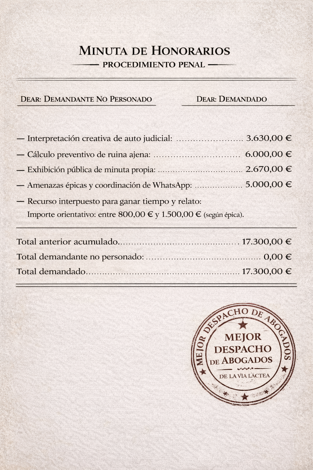 La publicación de una minuta de honorarios ya abonada es esencial. No importa que refleje únicamente el gasto del propio interesado; debe presentarse como un anticipo de la ruina ajena. La factura no acredita nada relevante en términos procesales, pero cumple una función clave: demostrar disposición al conflicto económico.