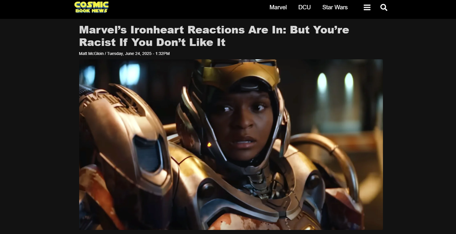 El artículo de *Cosmic Book News* se apoya en una de las tácticas más gastadas del manual de la polarización moderna: la falsa dicotomía. Nos presentan dos opciones: o adoras *Ironheart* con la devoción de un fanático en un concierto de Beyoncé, o eres un supremacista blanco que odia la diversidad. No hay término medio, no hay matices, no hay posibilidad de que simplemente no conectes con la serie por razones que nada tienen que ver con la raza de la protagonista. ¡Qué conveniente! Es como si dijeran que si no te gusta el sushi, odias la cultura japonesa, o que si no soportas el reguetón, eres anti-latino.