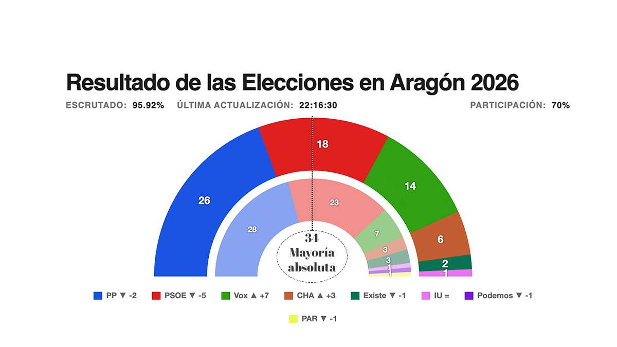 PP gana las elecciones en Aragón con 26 escaños, PSOE iguala su peor resultado histórico con 18 y Podemos desaparece de las Cortes tras perder su único diputado